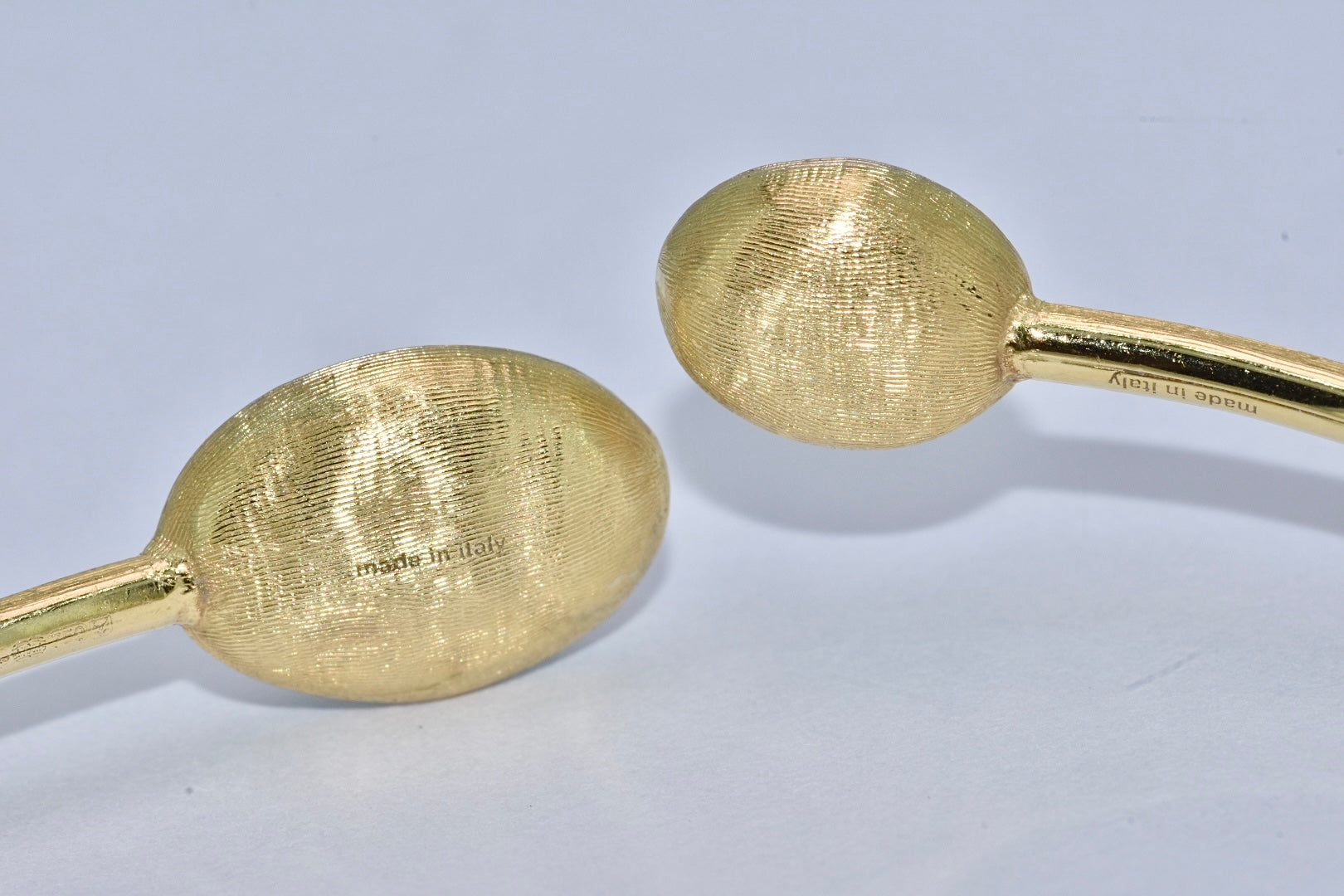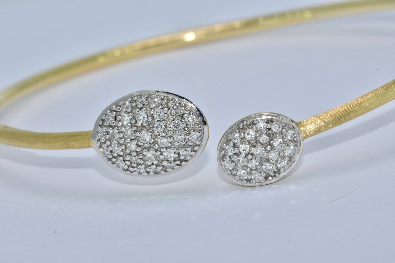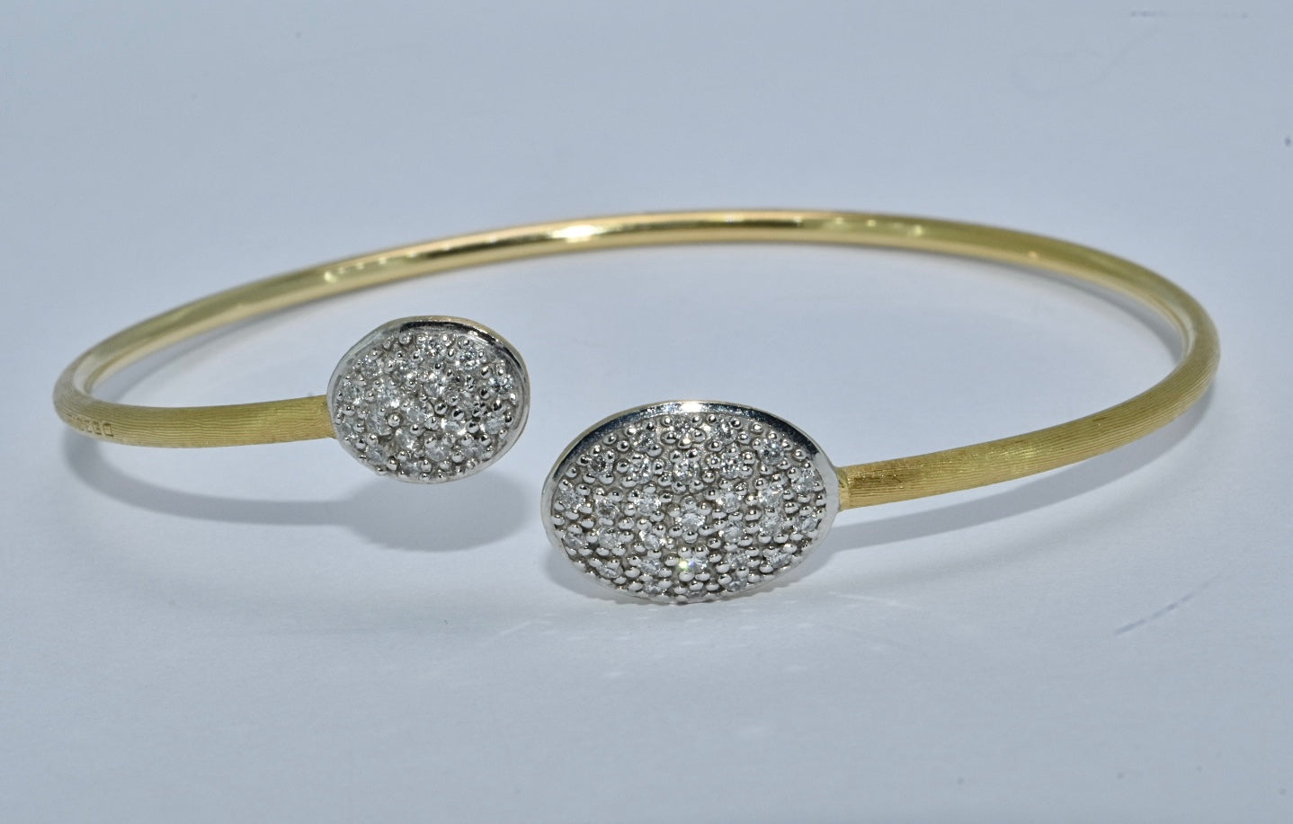 The bangle features two oval-shaped accents  embellished with approximately 0.15 carats and the other with 0.20 carats of brilliant-cut diamonds. The design wraps delicately around the wrist and is finished with Marco Bicego’s signature bulino engraving technique, giving it a beautifully textured, luminous surface.